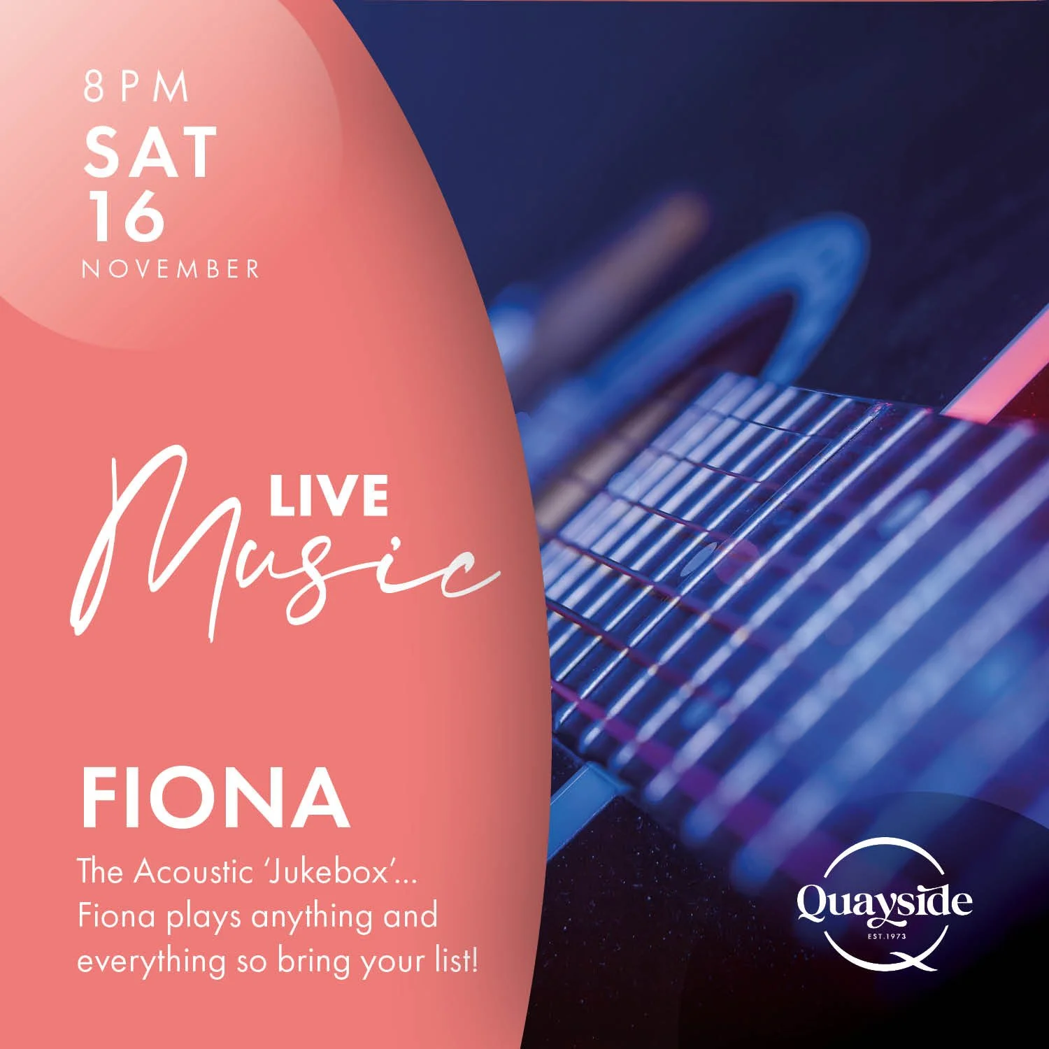 Experience the vibrant and electrifying atmosphere of live music at Quayside, your ultimate destination for musical entertainment. Whether you're a local or a visitor, our venue has something to offer everyone. Immerse yourself in a diverse range of genres, from foot-tapping pop cover to memorable rock anthems, and everything in between, performed by our lineup of featured talented local artists, guaranteeing a memorable experience for music lovers of all tastes.